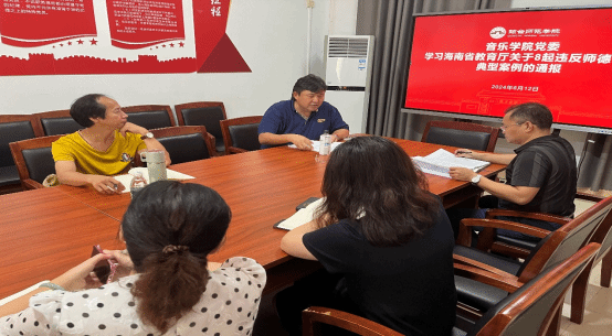 音乐学院党委于2024年6月12日,在音乐学院党员活动室召开《关于认真学习领会习近平总书记关于全面加强党的建设的重要论述扎实开展党纪学习教育的通知》及《海南省教育厅关于8起违反师德师风典型案例的通报》学习会议,音乐学院全体党委委员、支部书记、支部委员参加会议,党委书记刘才喜主持会议。