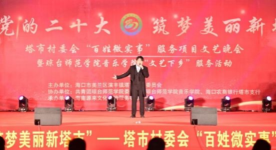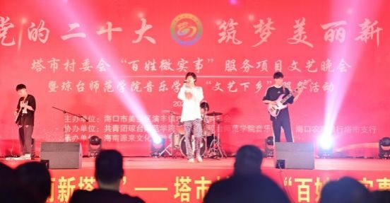 为了深入贯彻党的二十大精神,满足基层群众精神文化需求,4月15日,“礼赞党的二十大·筑梦美丽新塔市”文艺演出暨琼台师范学院音乐学院“文艺下乡”服务活动在海口市演丰镇塔市村举行。演丰镇人民政府党委书记王贤华、演丰镇人民政府党委副书记、镇长李海花出席活动,我校团委办公室副主任何永亮、音乐学院副教授李福顺参加。