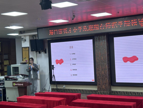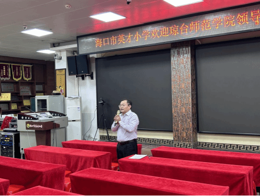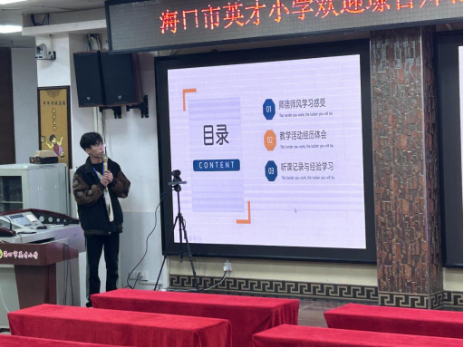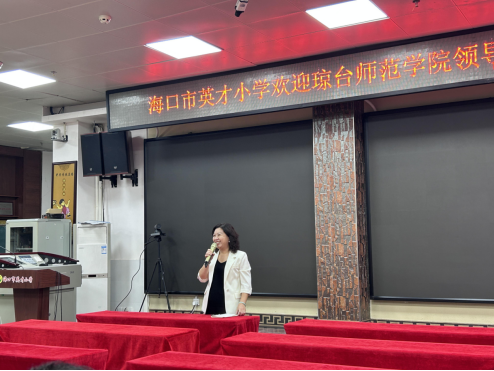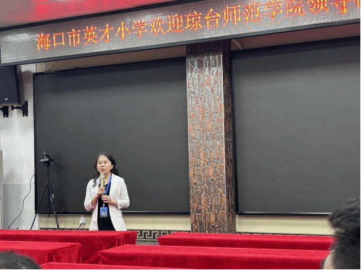 第三项·由海口市英才小学各科指导老师代表发言,提出了对实习生的建议和展望:各学院实习生们都能积极配合指导老师布置的任务和工作,接下来的工作中希望实习生们能够多主动向指导老师请教和沟通,专业能力需要加强,主科实习生们能够随班,辅助班主任工作的开展,其他学科的实习生同样也要进入课堂中学习班主任工作。