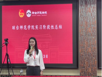 第二项·由琼台师范学院各学院实习生代表发言,进行各学院的阶段性总结:首先由音乐学院起头:主要从听课、上课、班队活动、实习阶段总结并展示了相对应的图片进行汇报。