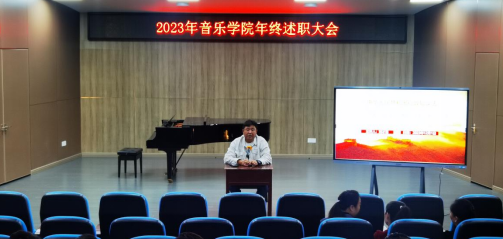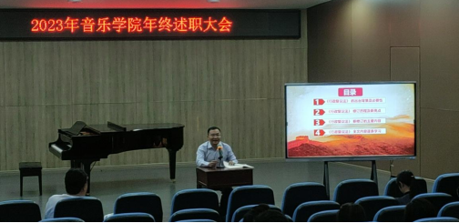 2023年12月5日下午,音乐学院在综合楼B栋101音乐厅组织全体教职工召开2023年终考核评优述职大会。活动由音乐学院院长贾志宏主持。出席本次会议的有学院领导刘才喜书记、贾志宏院长及全体教职员工。