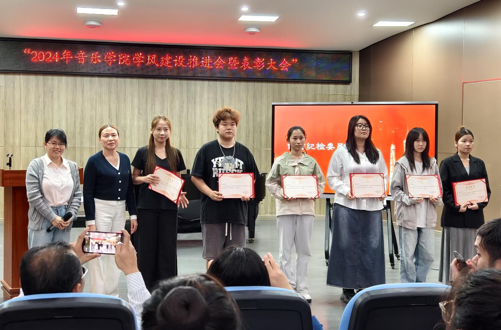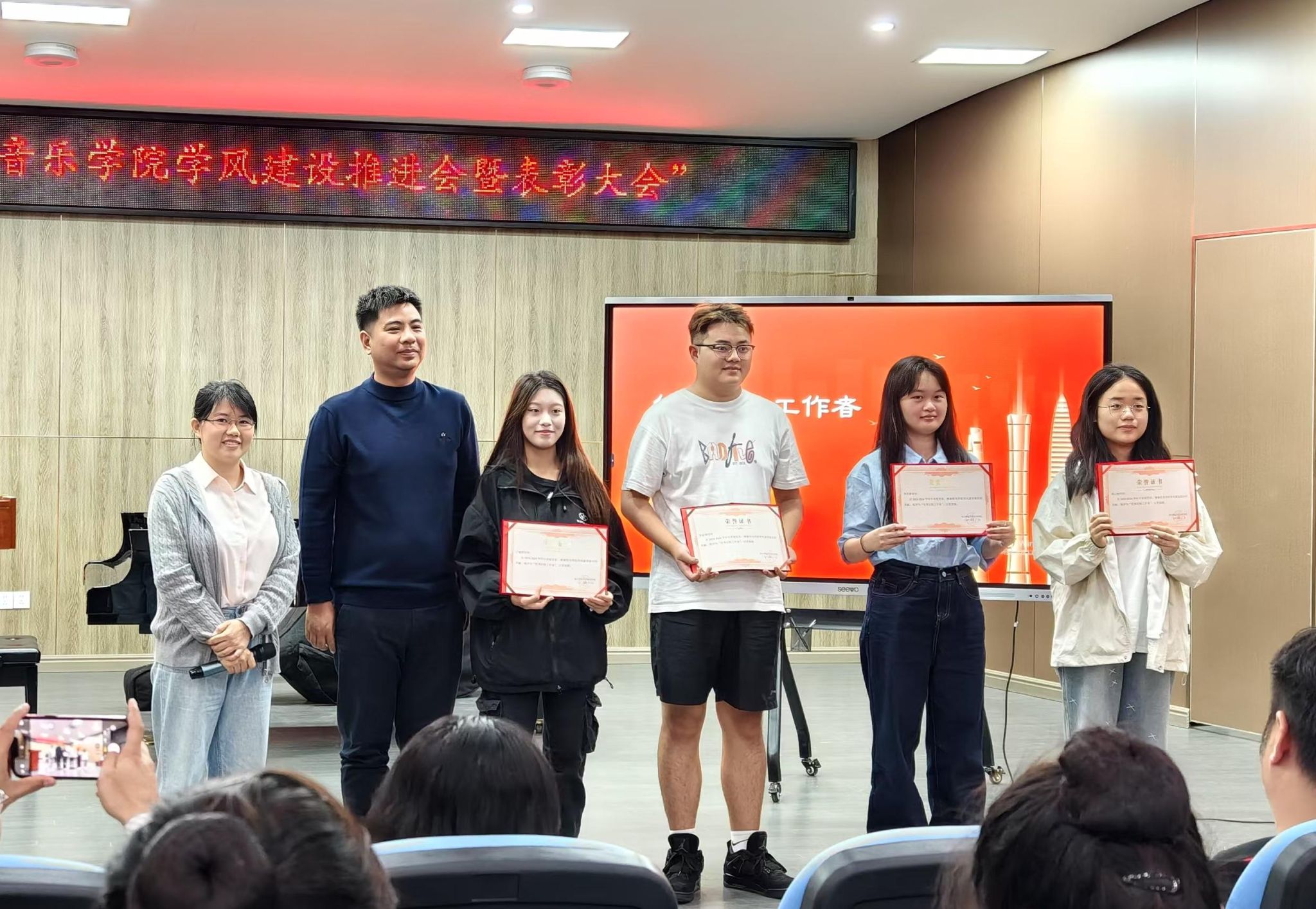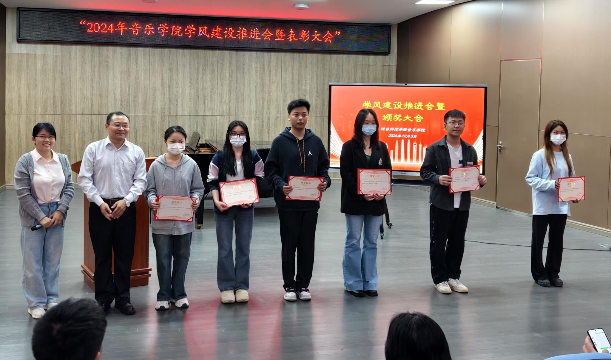 为进一步加强学风建设,表彰先进典型,推动优良学风的形成,音乐学院于12月3日在音乐厅举行学风建设推进会暨表彰大会。音乐学院党委书记刘才喜、副院长庄小清、党委副书记文海花、学工办主任洪飞出席活动并为获奖学生颁奖,辅导员姜雅峰、吴政霖、符东海到会参与,近200名新生到场观摩学习。