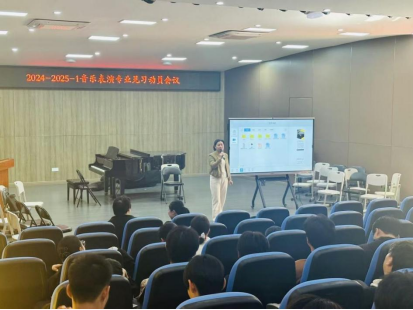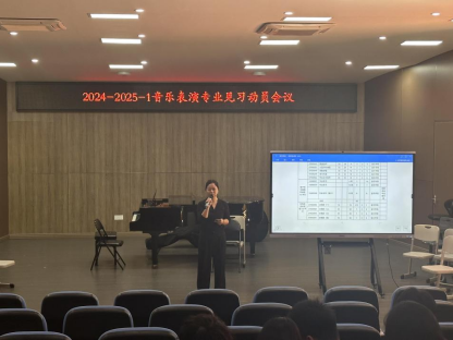 2024年12月2日上午8点,音乐学院于综合楼音乐厅召开音乐表演专业见习动员大会。音乐学院党委书记刘才喜,副院长庄小清,音乐表演系主任万媛媛,指导老师戈海涛、王泽、刘婉如及22音乐表演1班、24音乐表演2班、24音乐表演3班全体同学参与会议。