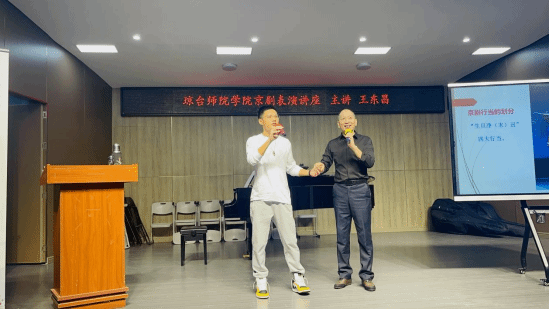 “言传身教”,培养专业艺术修养。王东昌、胡路通过京剧唱腔、演唱情绪以及舞台动作,从发声技巧到气息运用,讲解了京剧唱腔的核心要领,并现场示范经典曲目,紧扣实践教学,传递了中国传统艺术中蕴含的爱国精神与民族自豪感和京剧的独特魅力。