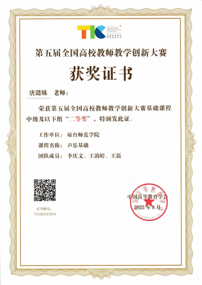 2025年8月16日—19日,由教育部高等教育司主办的第五届全国高校教学创新大赛国赛在北京理工大学举行,我院唐懿姝博士主讲的《声乐基础》课程凭借突出的教学创新设计,历经校赛、省赛及国赛遴选赛的层层考验,在全国赛中斩获基础课程组二等奖。该课程作为赛事举办以来海南省首门入围国赛的音乐类课程,一举创下了我省在该赛事音乐学科领域的历史性突破,充分彰显了我院教师队伍在教学改革与创新实践中的卓越实力。