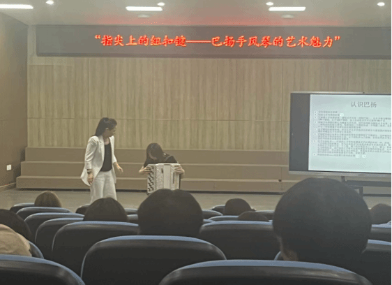 15:00,孟楠副教授主讲“指尖上的纽扣键——巴扬手风琴的艺术魅力”环节,以“乐器体验+艺术启蒙”为脉络构建新生与手风琴艺术的连接。