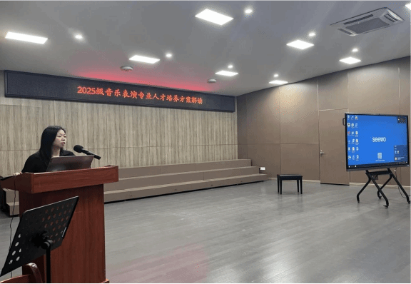 14:30,音乐表演系主任万媛媛主持“2025级音乐表演专业人才培养方案解读”环节。她从学院发展历程、专业定位等方面切入,系统梳理专业核心特色与发展前景,并重点解读课程体系与培养目标。