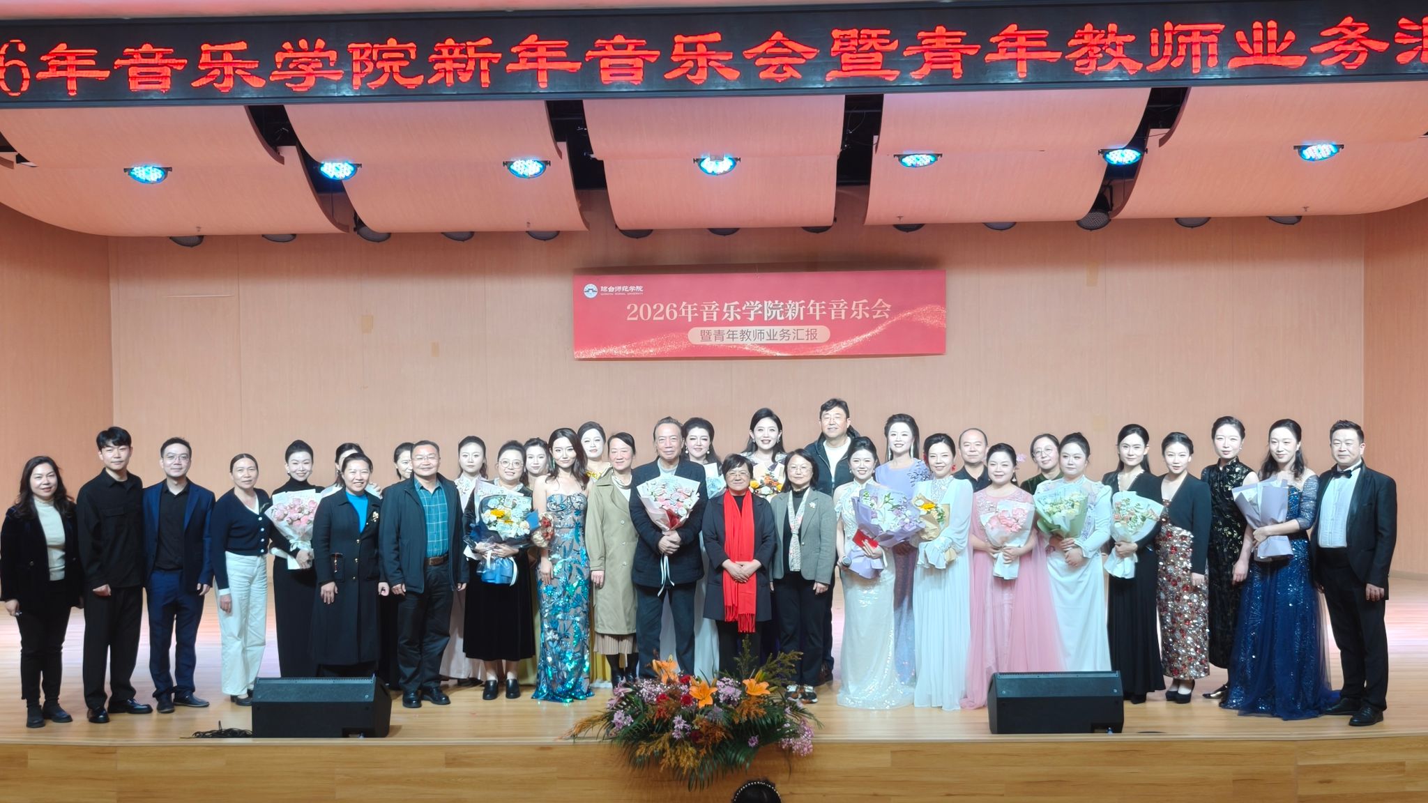 2026年1月6日晚,音乐学院成功举办新年音乐会暨青年教师业务汇报活动。琼台师范学院党委副书记刘湘洪、副校长王琰春、副校长林琛等领导出席,与师生共赏音乐会。